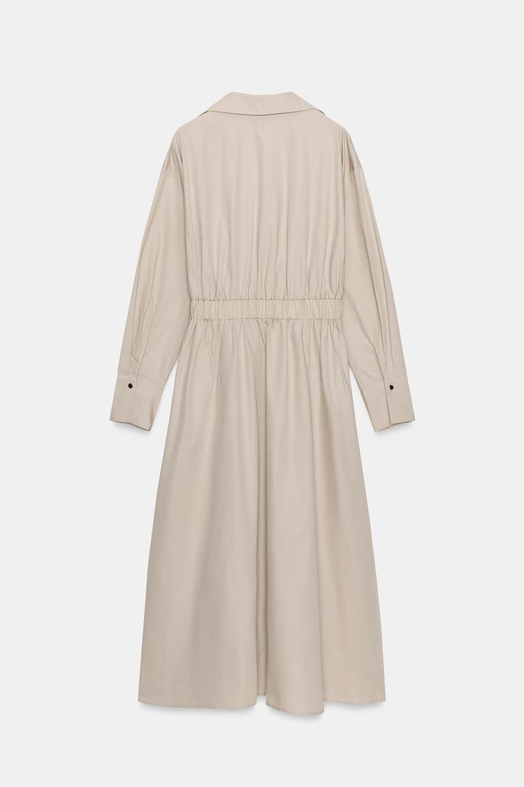 Grâce à sa taille élastique au dos et sa ceinture contrastée avec boucle métallique, la robe souligne délicatement la taille et crée une allure féminine et raffinée.